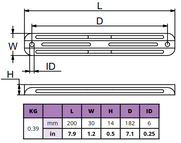 Medidas (mm): L: 200, W: 30, H: 14, D: 182, ID: 6 (Ver imagen 2)