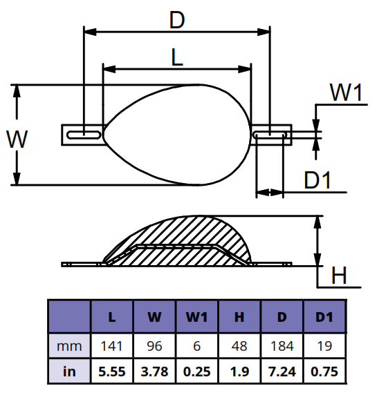 SKU: CM-2000Z Categorías: Accesorios, Anodos, Casco ANODO DE ZINC TIPO PEZ C/SOPORTE 147X95 MM Para atornillar o soldar. Medidas (mm): L: 141, W: 96, W1: 6, H: 48, D: 184, D1: 19 (Ver imagen 2) Productos relacionados ANODO TIMON 90 mm ANODO TIMON 50 mm ANODO BAGLIETTO 120 mm. LUZ FLOTANTE SOLAS