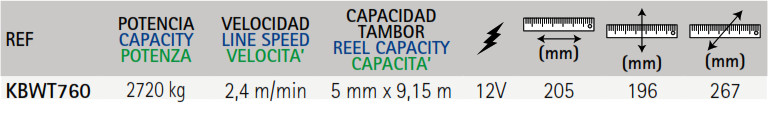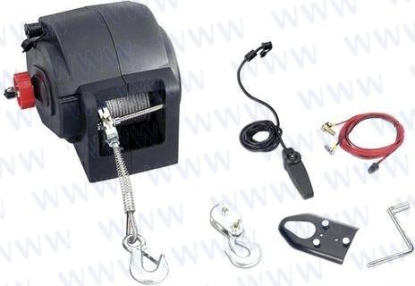 Cabrestante eléctrico por control remoto. Cable electrico de 3 m. con interruptor. Cable de alimentación de 1,8 m (-) y 7,6 m (+) con fusible de protección de 40A. Con guia de recogida del cable en el tambor. Cubierta de plástico resistente a la intemperie. Se suministra con placa adaptadora de bola, polea de desvio y palanca de emergencia.