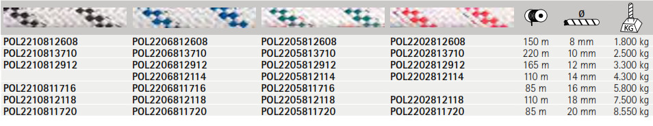 Cabo trenzado pre-estirado con alma de poliester y funda exterior de poliester de 32 cordones. Mínimo estiramiento. Ideal para drizas.
