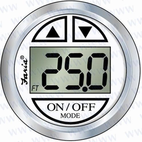 Sonda electrónica digital, marca Faria, color Chesapeake SS White, de gran precisión hasta 61 m. Lectura en metros, pies y brazas. Permite ajustar la distancia desde la quilla. Alarma sonora y visual de poca profundidad y aguas profundas. Incluye transductor de popa. 8-16V, Ø 52 mm.